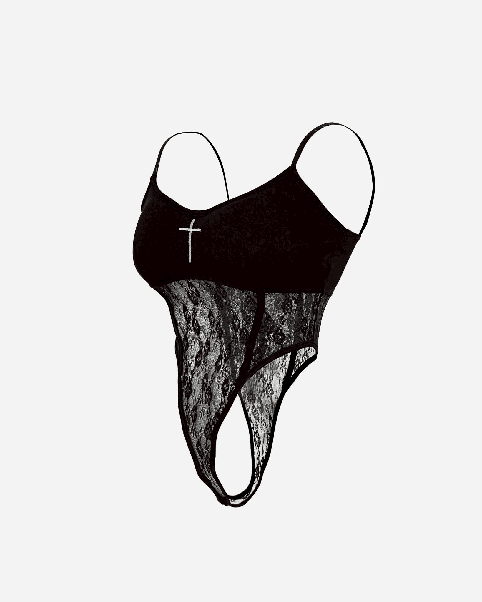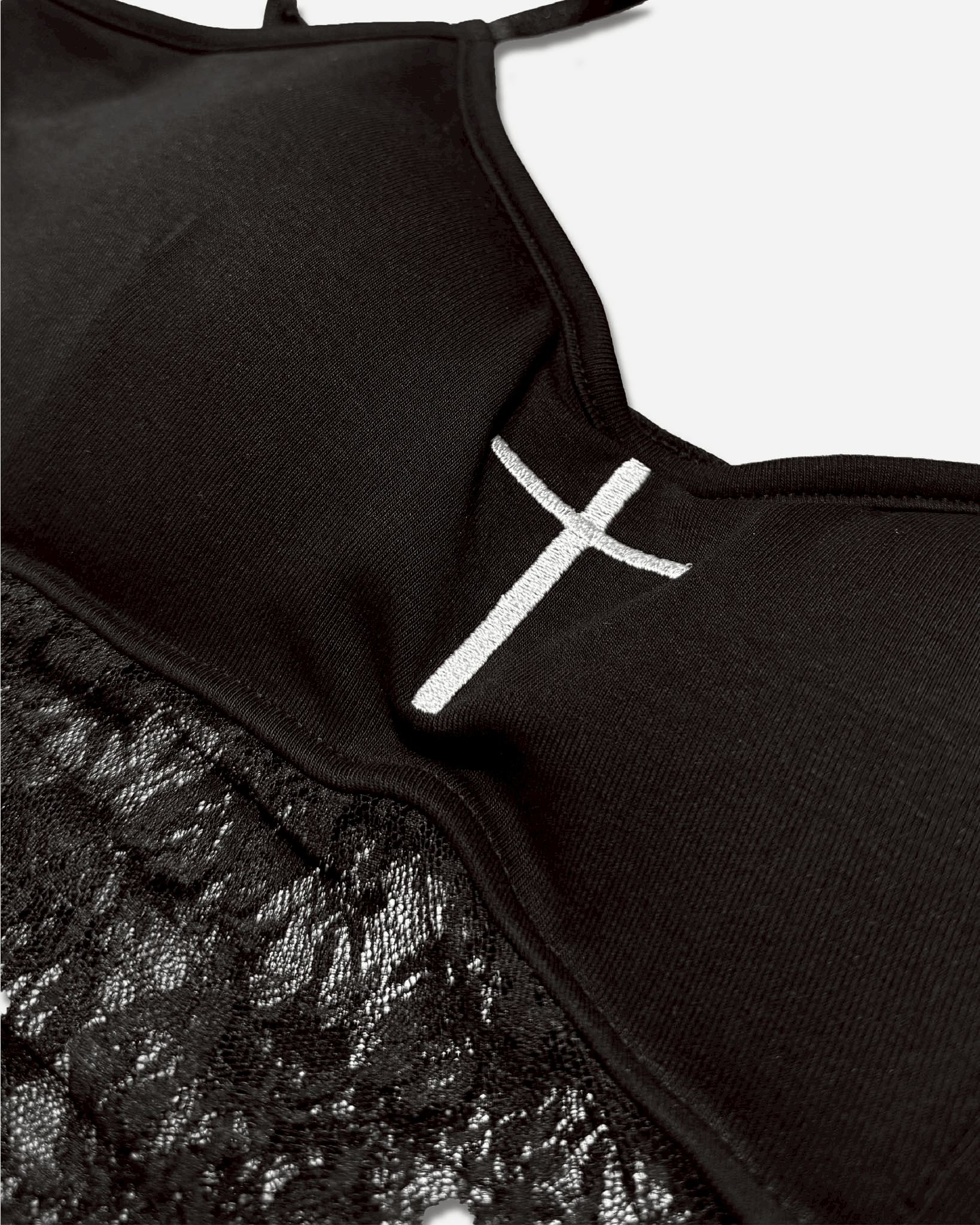 |High-density embroidered cross insignia at the chest.