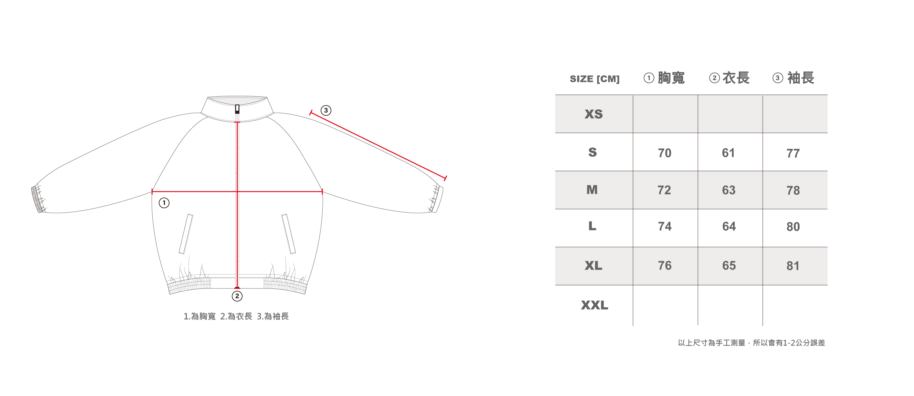 XL:胸寬 76 / 袖長 81 / 衣長 65