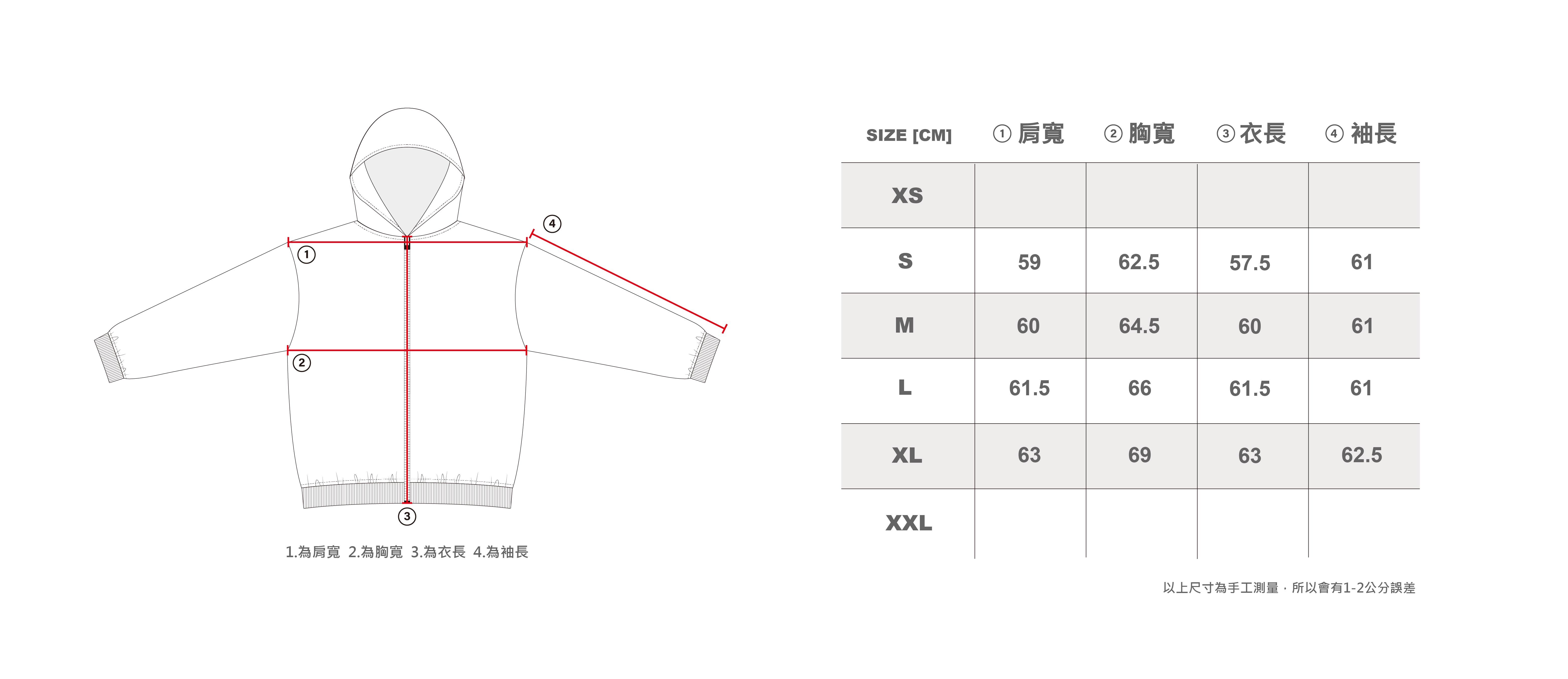 XL:肩寬 63 / 胸寬 69 / 袖長 62.5/ 衣長 63
