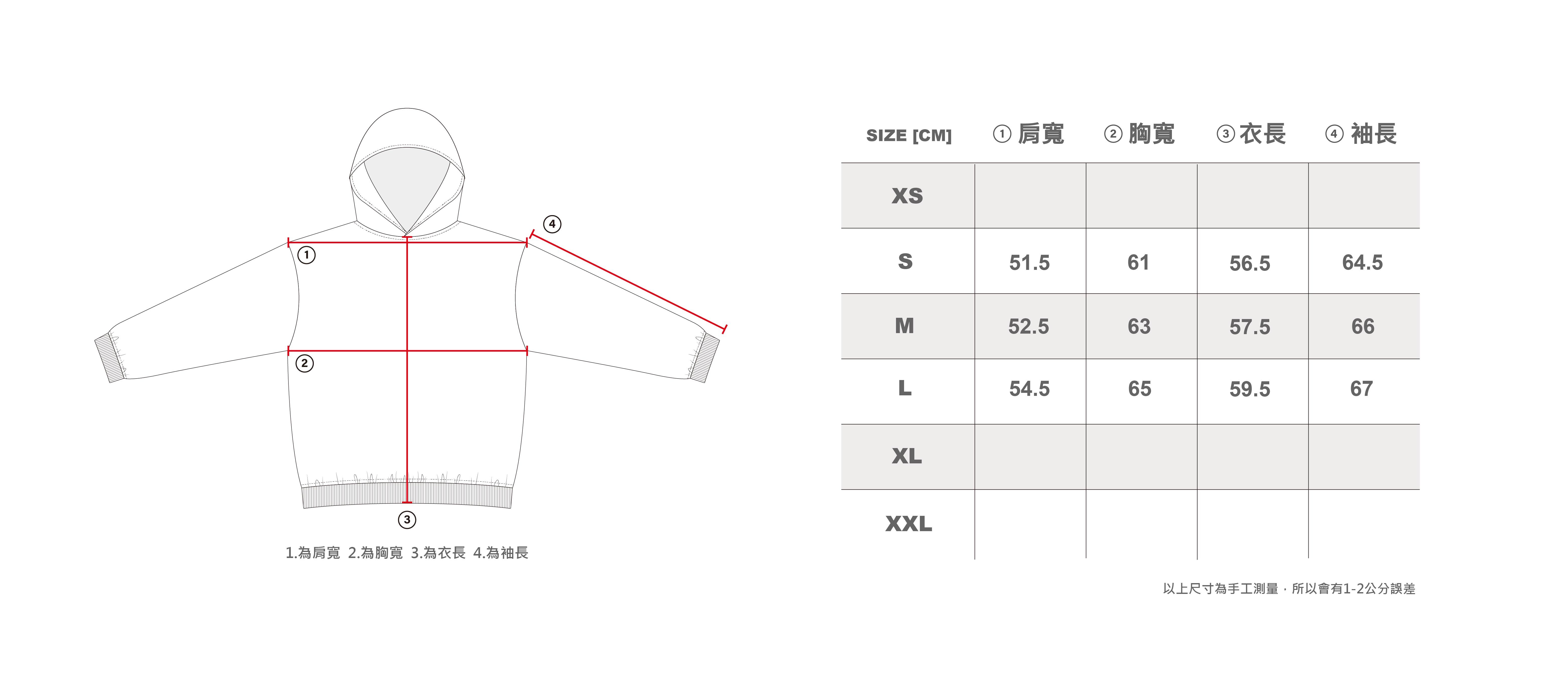M:肩寬 52.5/ 胸寬 63/ 袖長 66 / 衣長 57.5