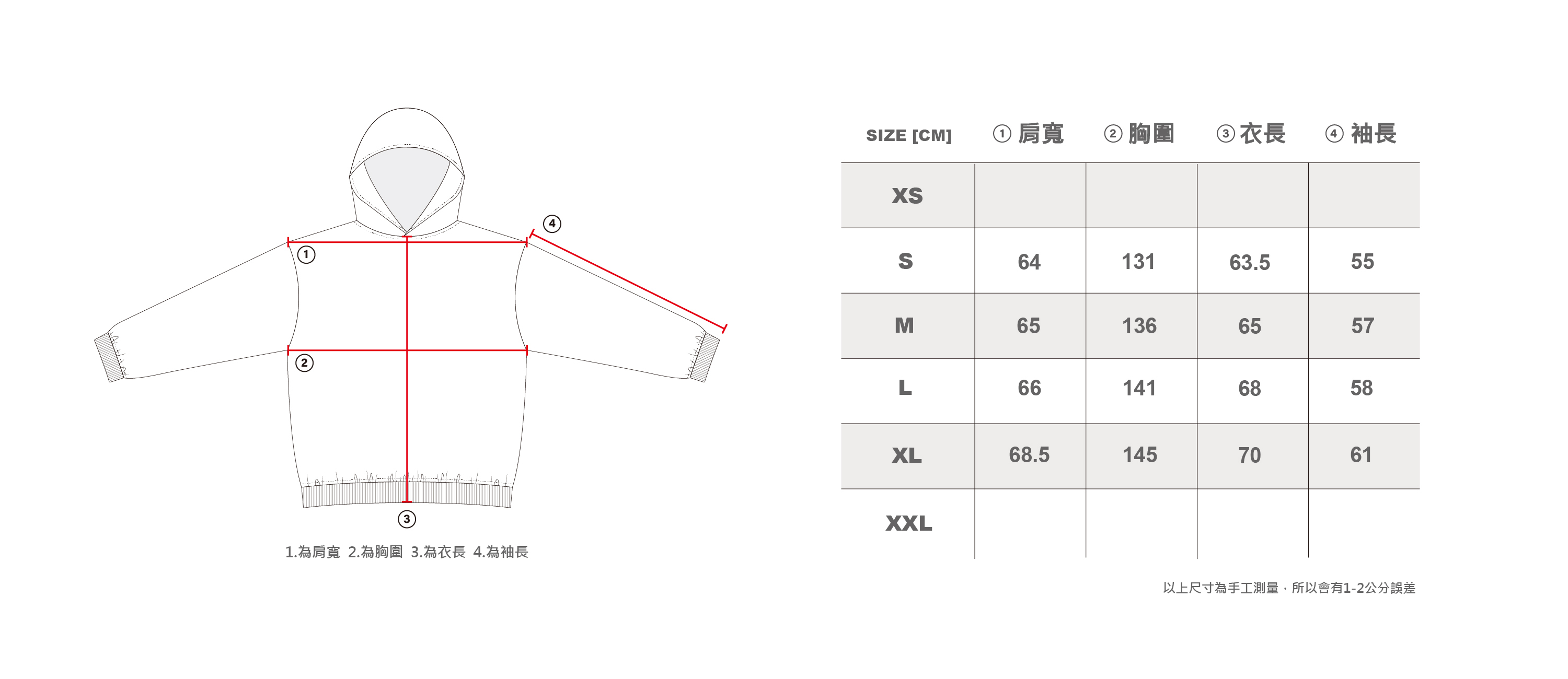 XL:胸寬 72.5 / 肩寬 68.5 / 袖長 61 / 衣長 70