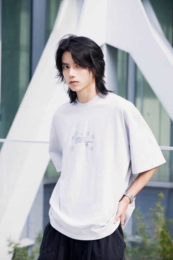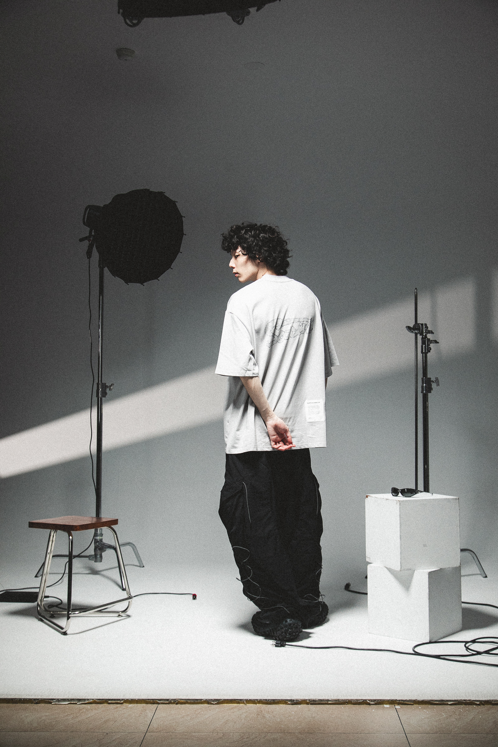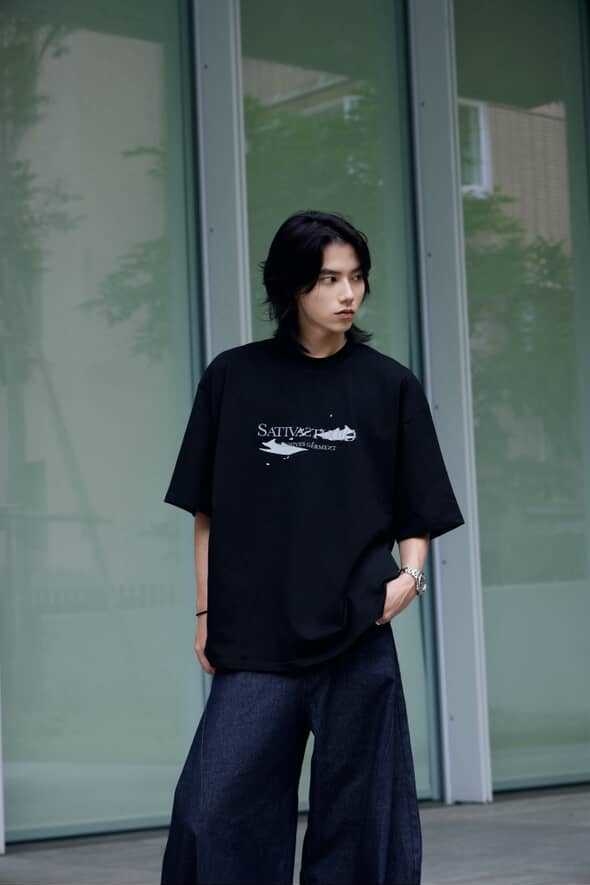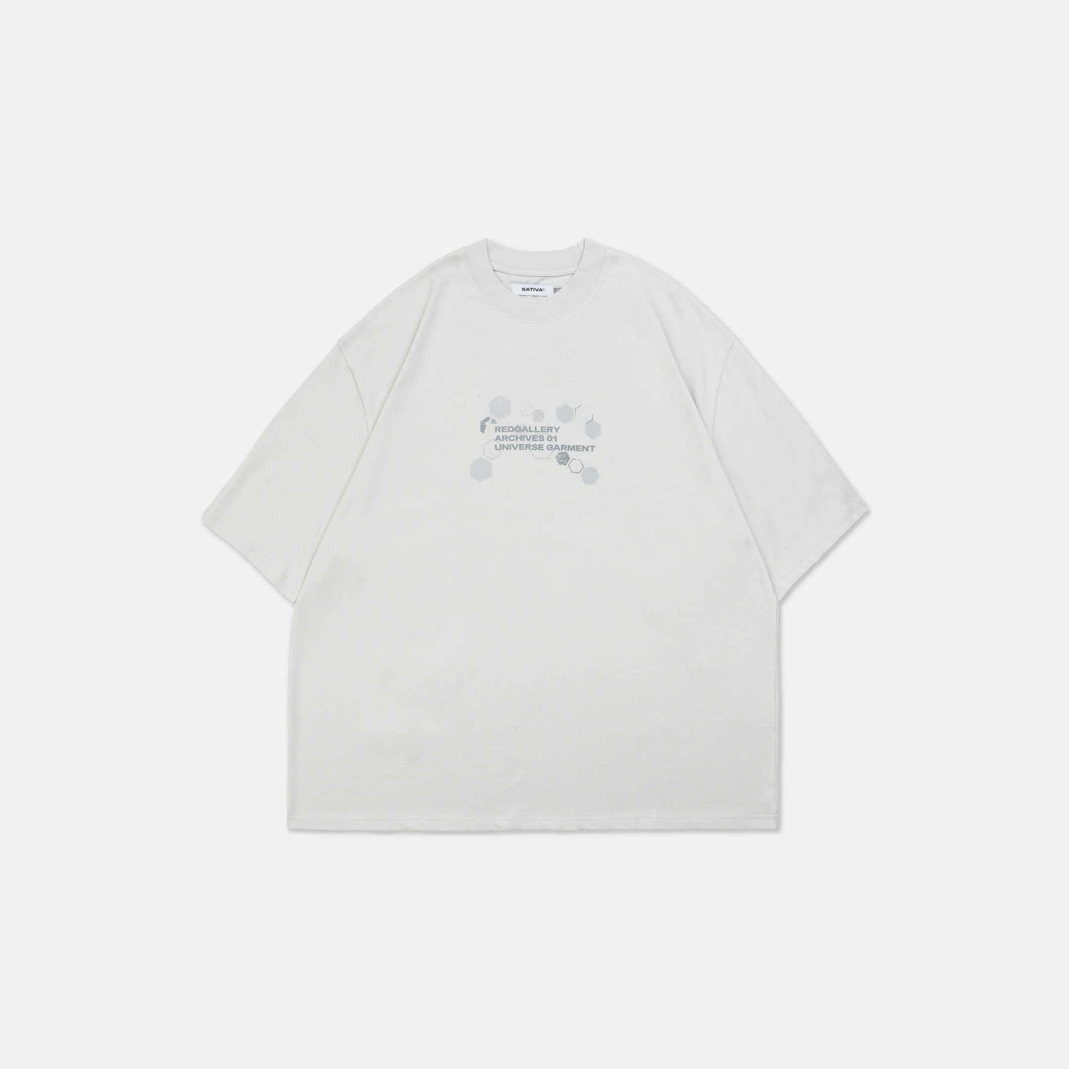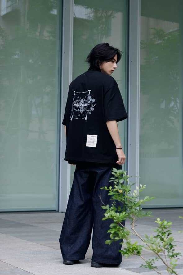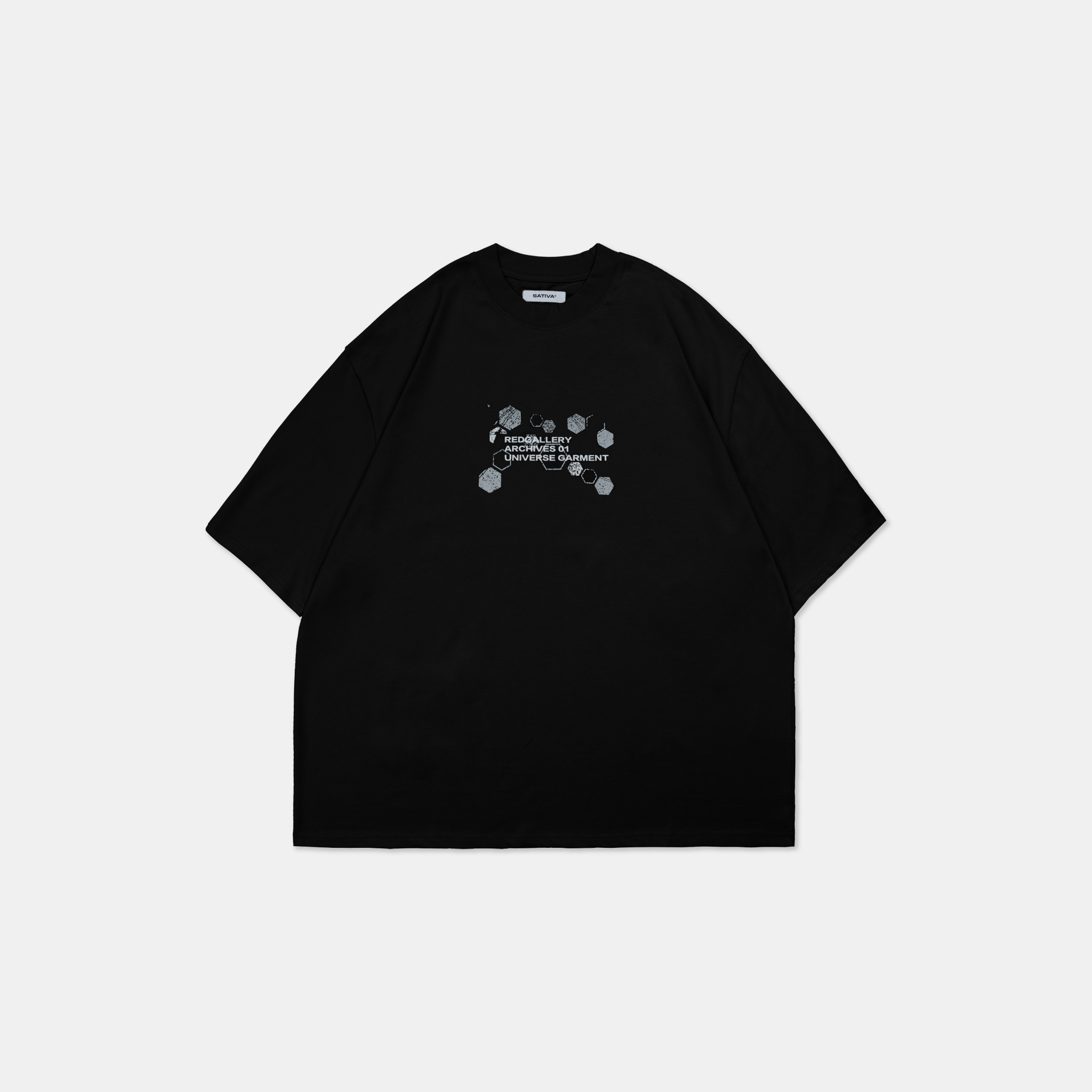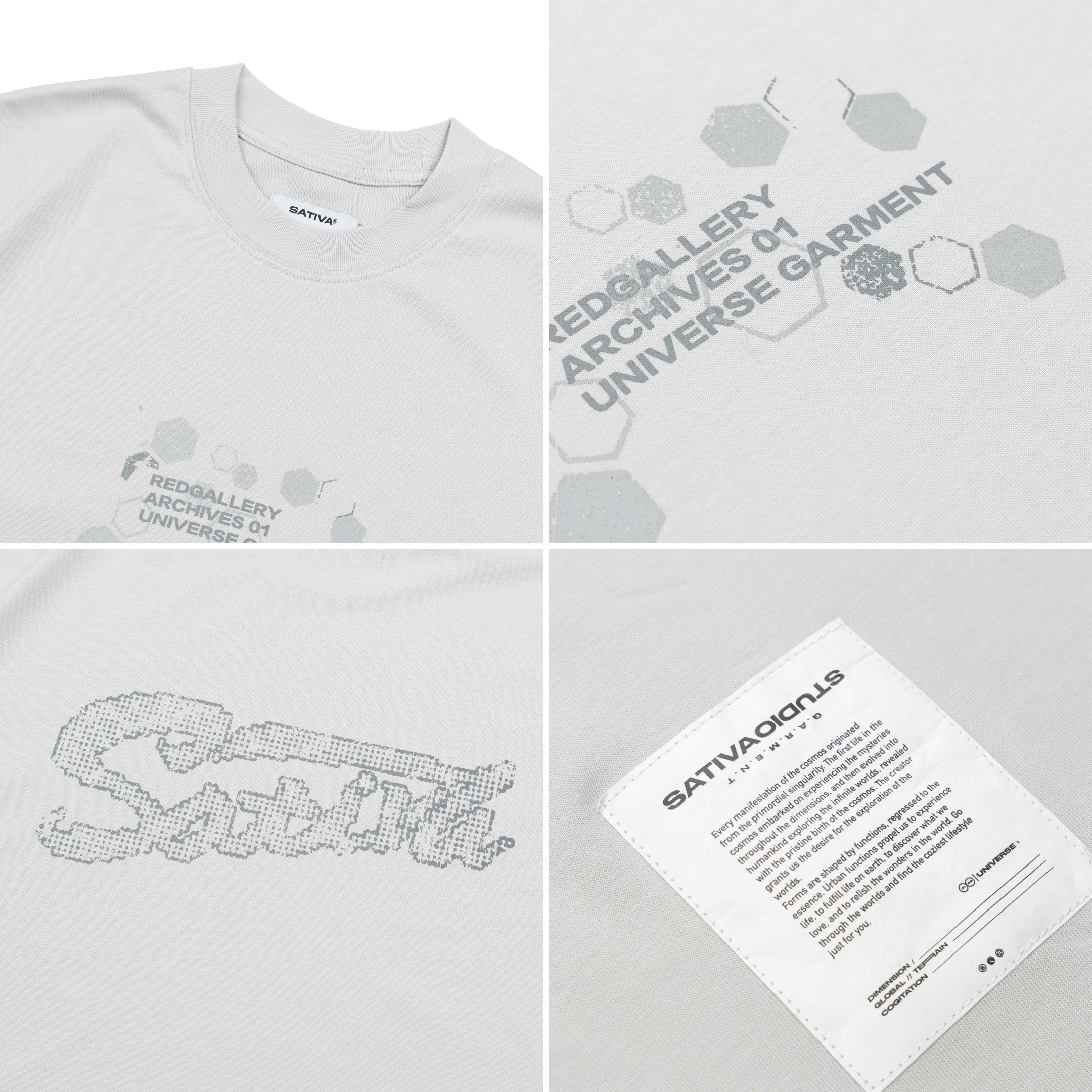 本次作品採100% Cotton舒適透氣面料,在實驗情境中,我們假設穿著者更加注重穿著面料的感受與穿著效果。在這其中,棉質材質更能撐起穿著者的版型需求,同時加深其設計意象。正面主視覺以零星散落的巢狀結構,並以破損效果象徵其特殊性,在穩定的結構中尋求、理解並再製其架構,逐步拼湊屬於自身的認知歸因;後背視覺則以點陣化效果以及品牌泰維克標點綴,作為整體寓意的呈現,藉此暗示SATIVASTUDIO的實驗精神。